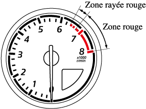 Lorsque l'aiguille du compte-tours entre dans la ZONE HACHURÉE, cela indique au conducteur qu'il faut changer de vitesse avant d'arriver à la ZONE ROUGE.