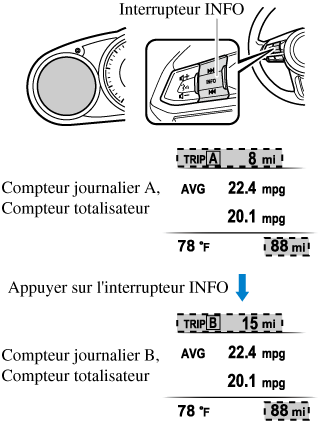 Lorsque le compteur journalier A est sélectionné, TRIP A sera affiché. Lorsque le compteur journalier B est sélectionné, TRIP B sera affiché.