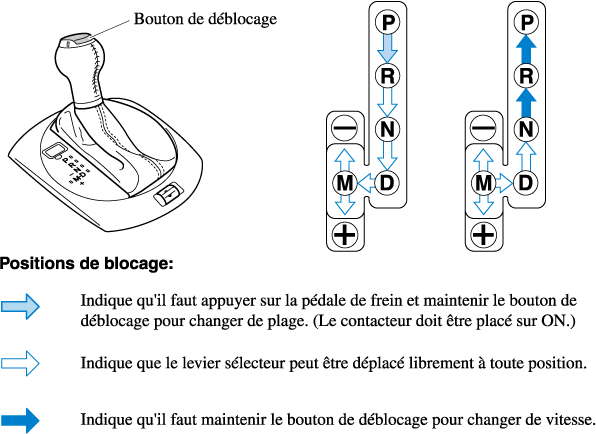 La Sport AT possède une option que ne possède pas la boîte de vitesses automatique traditionnelle, qui permet au conducteur de choisir lui-même chaque rapport au lieu de laisser entièrement le choix du changement de vitesses à la boîte de vitesses. Même si l'on a l'intention d'utiliser les fonctions de boîte de vitesses automatique comme boîte automatique traditionnelle, il faut aussi bien être conscient que l'on peut passer par mégarde en mode de changement de vitesses manuel et qu'un rapport inadéquat pourra alors être conservé lorsque la vitesse du véhicule augmente. Si l'on remarque que le régime du moteur augmente ou que le moteur s'emballe, vérifier si l'on n'est pas passé par mégarde en mode de sélection manuelle des rapports (Rechercher).