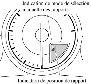 En mode de sélection manuelle des rapports, l'indication de position de plage de boîte de vitesse “M” s'allume sur le tableau de bord.