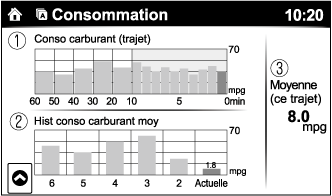 Après la réinitialisation des données des économies de carburant, “-- -” s'affiche tandis que l'économie moyenne de carburant est calculée.