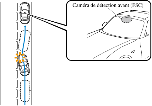 Le système détecte les lignes blanches ou jaunes sur la voie de circulation à l'aide de la caméra de détection avant (FSC) et, s'il détermine que le véhicule risque de quitter sa voie, il en informe le conducteur par l'activation du voyant LDWS et de l'avertissement sonore LDWS, ainsi que via l'affichage multi-informations (véhicules équipés).