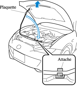 Soulever le capot, saisir l'endroit du caoutchouc sur la tige de support et le fixer la tige de support dans l'attache. Vérifier que la tige de support est fixée dans l'attache avant de fermer le capot.