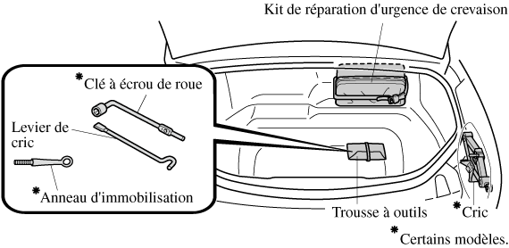 Votre véhicule peut ou peut ne pas être équipé d'un cric et d'une clé à écrou de roue. Pour plus de détails, s'adresser à un concessionnaire agréé Mazda.