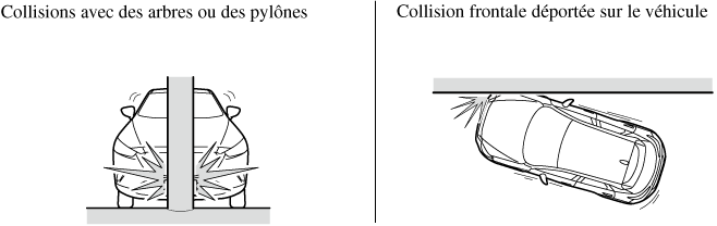 Les illustrations suivantes sont des exemples de collisions frontale/semi-frontale qui sont susceptibles de ne pas être détectées comme assez sévères pour justifier le déploiement de l'équipement de coussin d'air SRS.