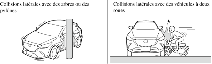 Les illustrations suivantes sont des exemples de collisions latérales qui sont susceptibles de ne pas être détectées comme assez sévères pour justifier le déploiement de l'équipement de coussin d'air SRS.