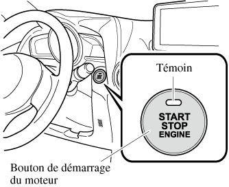 Si le voyant KEY (rouge) s'allume ou que le témoin du bouton de démarrage du moteur (ambre) clignote, il est possible que le moteur ne puisse démarrer en utilisant la méthode de démarrage usuelle. Faire inspecter le véhicule par un concessionnaire agréé Mazda dès que possible. Le moteur peut alors être démarré de force. Maintenir le bouton de démarrage du moteur jusqu'au démarrage du moteur. D'autres procédures de démarrage du moteur, telles que la présence de la clé dans la cabine et l'activation de la pédale d'embrayage (boîte de vitesses manuelle) ou la pédale de frein (boîte de vitesses automatique), doivent être respectées.