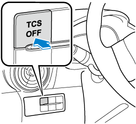 Appuyer sur l'interrupteur TCS OFF pour mettre le système de commande de traction hors fonction. Le témoin TCS OFF s'allume sur le tableau de bord.