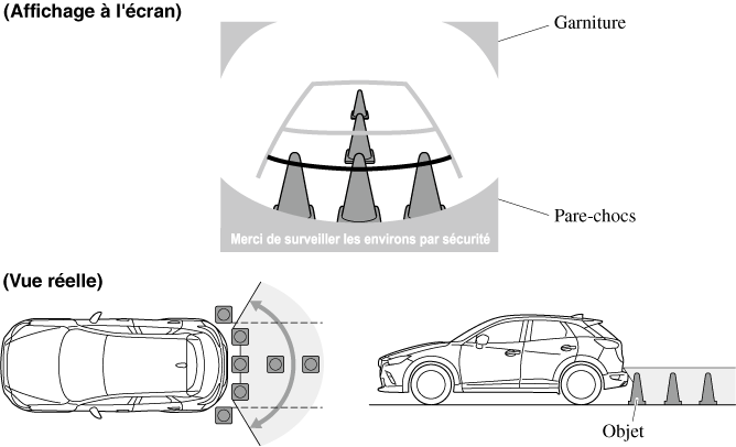 Le champ de vision est limité. Les objets sous le pare-chocs ou près des extrémités du pare-chocs ne peuvent pas être affichés.