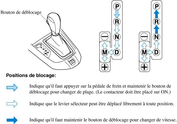 La Sport AT possède une option que ne possède pas la boîte de vitesses automatique traditionnelle qui donne au conducteur l'option de pouvoir choisir lui-même chaque rapport au lieu de laisser entièrement le choix du changement de vitesses à la boîte de vitesses. Même si l'on a l'intention d'utiliser les fonctions de boîte de vitesses automatique comme boîte automatique traditionnelle, il faut aussi bien être conscient que l'on peut passer par mégarde en mode de changement de vitesses manuel et qu'un rapport inadéquat pourra alors être conservé lorsque la vitesse du véhicule augmente. Si l'on remarque que le régime du moteur augmente ou que le moteur s'emballe, vérifier si l'on n'est pas passé par mégarde en mode de sélection manuelle des rapports (Rechercher).