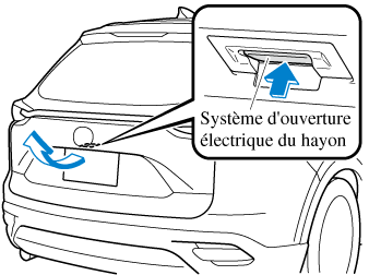 Appuyer sur le système d'ouverture électrique du hayon, puis soulever le hayon. Les feux de détresse vont clignoter deux fois et le hayon s'ouvre automatiquement après le bip sonore.