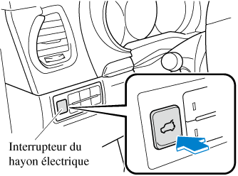 Appuyer sur l'interrupteur du hayon électrique pendant environ une seconde ou plus pendant que le hayon est en position ouverte/fermée complète. Les feux de détresse vont clignoter deux fois et le hayon s'ouvre/se ferme complètement après le bip sonore.