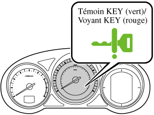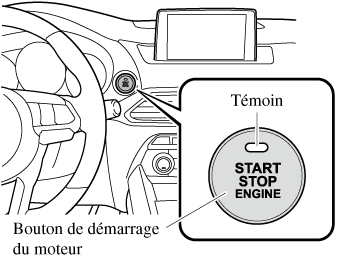 Si le voyant KEY (rouge) s'allume ou si le témoin du bouton de démarrage du moteur (ambre) clignote, cela peut indiquer un problème dans le système de démarrage du moteur lors de l'utilisation habituelle du démarrage (pour les véhicules équipés d'un tableau de bord de type A (Rechercher), les messages s'affichent sur le tableau de bord). Faire inspecter le véhicule par un concessionnaire agréé Mazda dès que possible. Le moteur peut alors être démarré de force. Maintenir le bouton de démarrage du moteur jusqu'au démarrage du moteur. D'autres procédures de démarrage du moteur doivent être respectées, telles que la présence de la clé dans la cabine et la pédale de frein enfoncée.