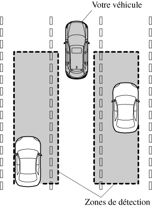 La BSM détecte les véhicules arrivant de l'arrière lorsque le véhicule se déplace vers l'avant à une vitesse de 10 km/h (6,3 mi/h) ou plus et notifie le conducteur via les voyants de BSM et en affichant l'écran de détection de véhicules (véhicules avec affichage multi-informations et de conduite active).