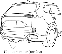 Pour les réparations ou le remplacement des capteurs radar (arrière), ou des réparations au pare-chocs, du travail de peinture et le remplacement à proximité des capteurs radar, consulter un concessionnaire agréé Mazda.