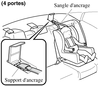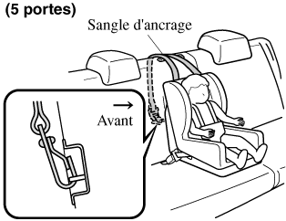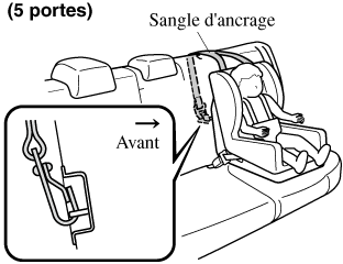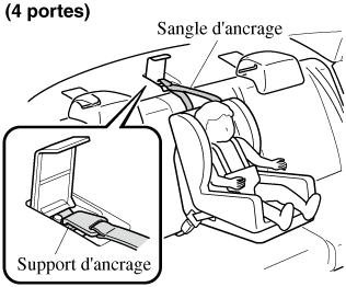 Ce véhicule Mazda est équipé d'ancrages inférieurs LATCH pour la fixation de systèmes de dispositif de sécurité pour enfants de type LATCH spécialement conçus, sur le siège arrière. Les deux ancrages doivent être utilisés, sinon le siège bougera et sera dangereux pour l'enfant s'y trouvant. Certains systèmes de dispositif de sécurité pour enfants de type LATCH doivent aussi être fixés avec une sangle d'ancrage pour être correctement fixés. S'ils sont équipés d'une sangle d'ancrage elle doit être utilisée pour assurer la sécurité de l'enfant.