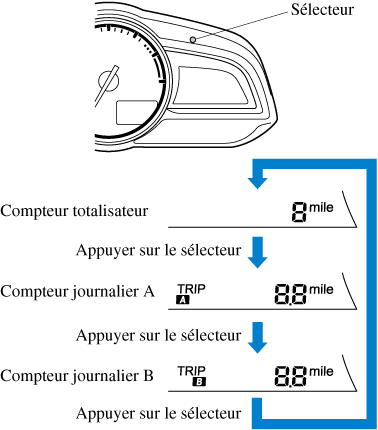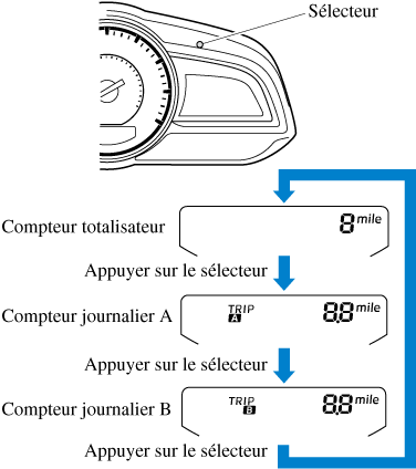 Le mode d'affichage peut être changé entre l'affichage du compteur totalisateur, du compteur journalier A et du compteur journalier B en appuyant sur le sélecteur pendant que l'un d'eux est affiché. Le mode sélectionné sera affiché.