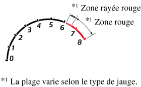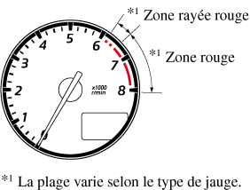 Lorsque l'aiguille du compte-tours entre dans la ZONE RAYÉE ROUGE, cela indique au conducteur qu'il faut changer de vitesse avant d'arriver à la ZONE ROUGE.