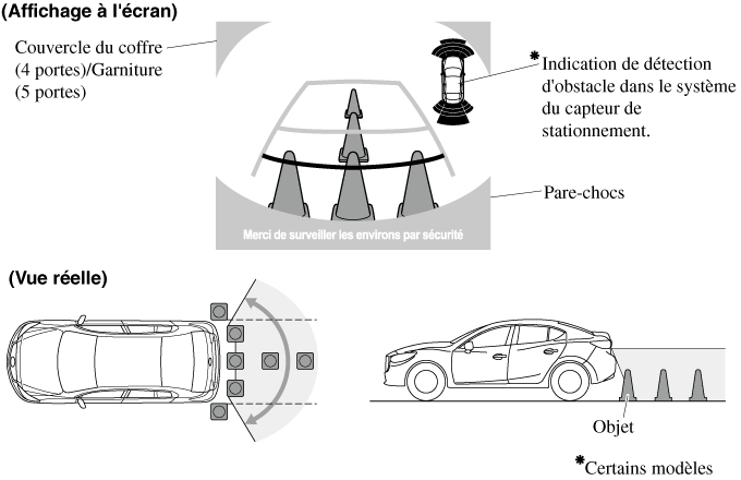 Le champ de vision est limité. Les objets sous le pare-chocs ou près des extrémités du pare-chocs peuvent ne pas être affichés.