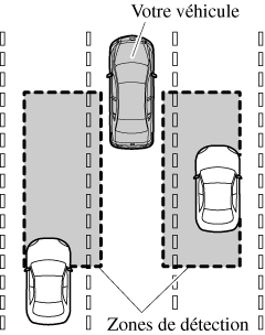 La zone de détection sur ce système couvre les voies de circulation des deux côtés du véhicule et depuis la partie arrière des portières avant à environ 50 m (164 pieds) derrière le véhicule.