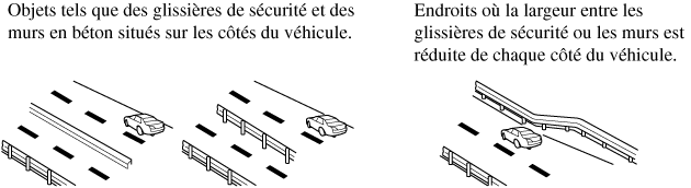 Si la largeur de la route est très étroite, des véhicules sur les deux voies peuvent être détectés. La zone de détection des capteurs radar (arrière) est déterminée selon la largeur de la route des autoroutes.