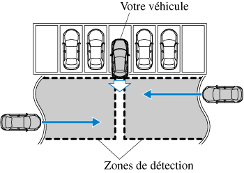 Le système RCTA détecte les véhicules qui s'approchent par les côtés gauche et droit ou par l’arrière du véhicule lorsque le véhicule fait marche arrière à partir d'un espace de stationnement, et avertit le conducteur de danger possible en utilisant les voyants de surveillance des angles morts (BSM) et l'avertisseur sonore.