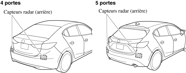 Pour les réparations ou le remplacement des capteurs radar (arrière), ou des réparations au pare-chocs, du travail de peinture et le remplacement à proximité des capteurs radar, consulter un concessionnaire agréé Mazda.