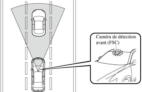 Dans les cas suivants, la caméra de détection avant (FSC) détermine qu'un véhicule est présent à l'avant et le système SCBS peut fonctionner.