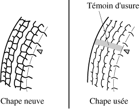 Il est nécessaire de remplacer le pneu avant que le témoin d'usure n'apparaisse en travers de la chape.