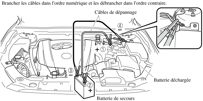 Le démarrage avec une batterie de secours est dangereux s'il n'est pas fait correctement. Suivre prudemment les instructions suivantes. Si l'on est pas certain de comment réaliser un démarrage avec une batterie de secours, s'adresser à un mécanicien compétent.