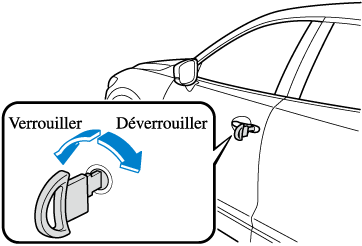 Toutes les portières de même que le hayon se déverrouillent lorsque la portière du conducteur est déverrouillée et que la clé auxiliaire est tenue en position de déverrouillage pendant une seconde ou plus.