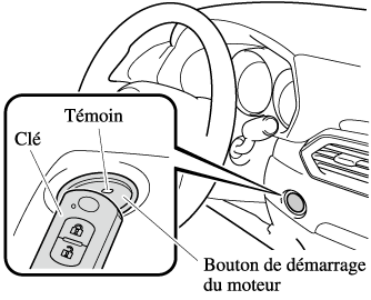 En cas d'anomalie avec la fonction du bouton de démarrage du moteur, le témoin du bouton de démarrage du moteur (ambre) clignote. Dans ce cas, il est possible que le moteur démarre, mais le faire inspecter dès que possible par un concessionnaire agréé Mazda.
