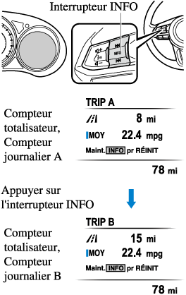 La distance de conduite pour un intervalle spécifié est indiquée. Il est possible de mesurer la distance de deux types d'intervalles (TRIP A, TRIP B) ainsi que l'économie moyenne de carburant pour chacun.