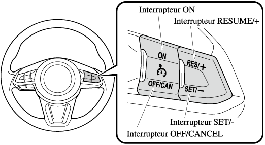 Si votre Mazda dispose des interrupteurs de direction suivants, alors elle est équipée du système de régulation de la vitesse à radar Mazda avec fonction Stop & Go (MRCC avec fonction Stop & Go).