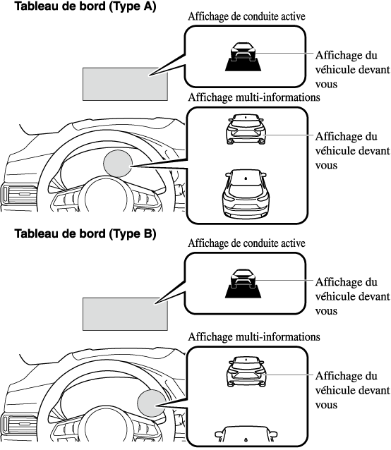 L'état de fonctionnement du DRSS est indiqué sur l'affichage multi-informations ou de conduite active. En ce qui concerne les dysfonctionnements, vérifiez les conditions du véhicule ou faites-le inspecter par un concessionnaire agréé Mazda conformément au contenu du message affiché.