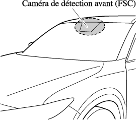 Ne pas heurter ou exercer une force considérable sur la caméra de détection avant (FSC) ou sur la zone environnante. Si la caméra de détection avant (FSC) subit un choc important, ou en cas de fêlure ou de dommages provoqués par des projections de graviers ou de débris dans la zone qui l'entoure, cesser d'utiliser les systèmes suivants et consulter un concessionnaire agréé Mazda.