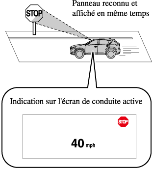 Si la vitesse du véhicule dépasse celle indiquée par le panneau de limitation de vitesse apparaissant sur l'affichage de conduite active en cours de conduite, le système alerte le conducteur par une notification sur l'affichage de conduite active et un signal sonore.