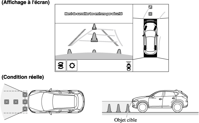 La portée de détection du capteur de stationnement est limitée. Par exemple, les obstructions se rapprochant sur le côté et les objets de faible hauteur peuvent ne pas être détectés. Toujours vérifier visuellement la sécurité du véhicule lors de la conduite.