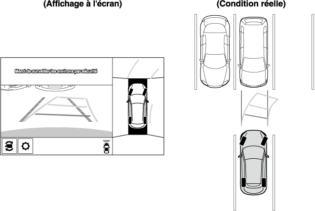 Sur l'écran de vue de dessus, les zones en noir à l'avant et à l'arrière de l'image du véhicule et les zones où les images des caméras se rejoignent sont des angles morts.
