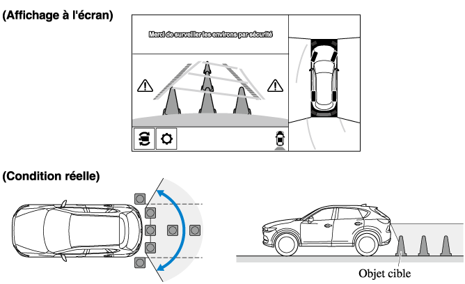 La portée de détection du capteur de stationnement est limitée. Par exemple, les obstructions se rapprochant sur le côté et les objets de faible hauteur peuvent ne pas être détectés. Toujours vérifier visuellement la sécurité du véhicule lors de la conduite.