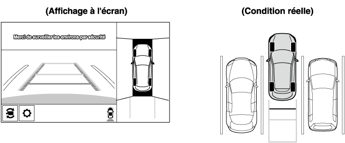 Comme il peut y avoir une différence entre l'image affichée à l’écran, comme indiqué ci-dessous, et les conditions réelles du stationnement, toujours vérifier la sécurité à l'arrière du véhicule et dans la zone environnante directement avec les yeux.
