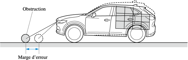 Il peut y avoir une certaine marge d'erreur entre la surface de la route apparaissant à l'écran et la surface réelle de la route. Une marge d'erreur dans la distance perçue pourrait conduire à un accident, soyez donc conscient des conditions suivantes qui peuvent plus facilement produire des erreurs dans la distance perçue.