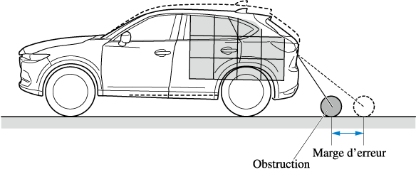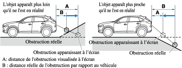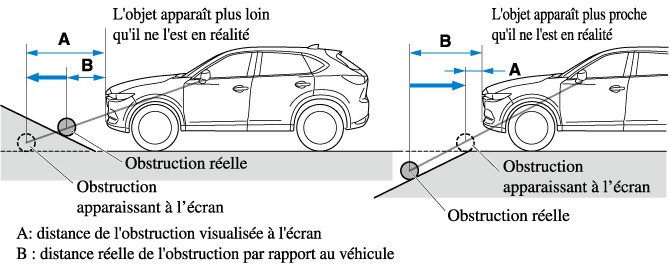 Si la route monte ou descend de manière abrupte à l'avant ou à l'arrière du véhicule, les obstructions détectées par la caméra peuvent sembler plus éloignées ou plus proches qu’elles ne le sont réellement.