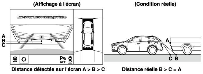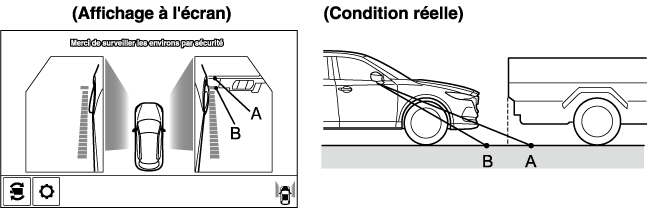 Étant donné que les lignes de guidage d’extrémité avant du véhicule ou les lignes de guidage de distance (caméra arrière) sont affichées sur la base d'une surface plane, la distance à l'objet en trois dimensions affichée sur l'écran est différente de la distance réelle.