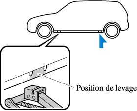 Le fait d'essayer de soulever le véhicule en utilisant des positions de levage autres que celles recommandées dans ce manuel est dangereux. Le véhicule peut glisser du cric et gravement blesser ou même tuer quelqu'un. N'utiliser que les positions de levage avant et arrière recommandées dans ce manuel.