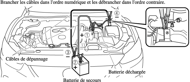 Couper le moteur du véhicule dépanneur et brancher les câbles de démarrage dans l'ordre suivant.