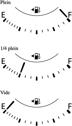 Après qu'on ait refait le plein de carburant, un certain temps pourra être nécessaire avant que l'indicateur se stabilise. En outre, il est possible que l'indicateur dévie lors de la conduite sur une pente ou dans un virage, en raison des mouvements du carburant à l'intérieur du réservoir.