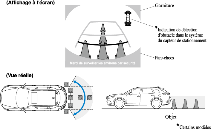 • Le champ de vision est limité. Les objets sous le pare-chocs ou près des extrémités du pare-chocs ne peuvent pas être affichés.