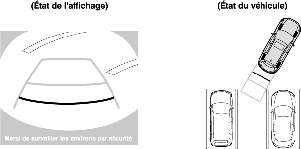 Après que le véhicule ait commencé à entrer dans l'espace de stationnement, continuer à reculer lentement de manière que les distances entre les lignes de largeur du véhicule et les côtés de l'espace de stationnement à gauche et à droite soient approximativement égales.