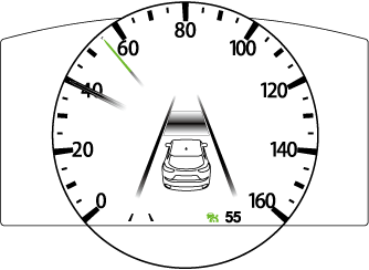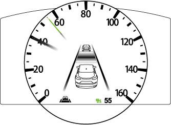 La vitesse réglée et l'affichage de la distance inter-véhicules est indiqué par des lignes blanches. L'indication principale (blanche) du système MRCC avec fonction Stop & Go passe à l'indication de réglage (verte) du système MRCC avec fonction Stop & Go en même temps.